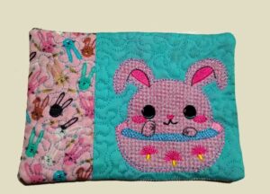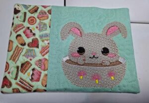 Bunny in a bowl coaster 5×7 – (mug rug) is stitched in 1 single hooping use your gorgeous fabric to make your coaster pop or put a design on one of the panels.