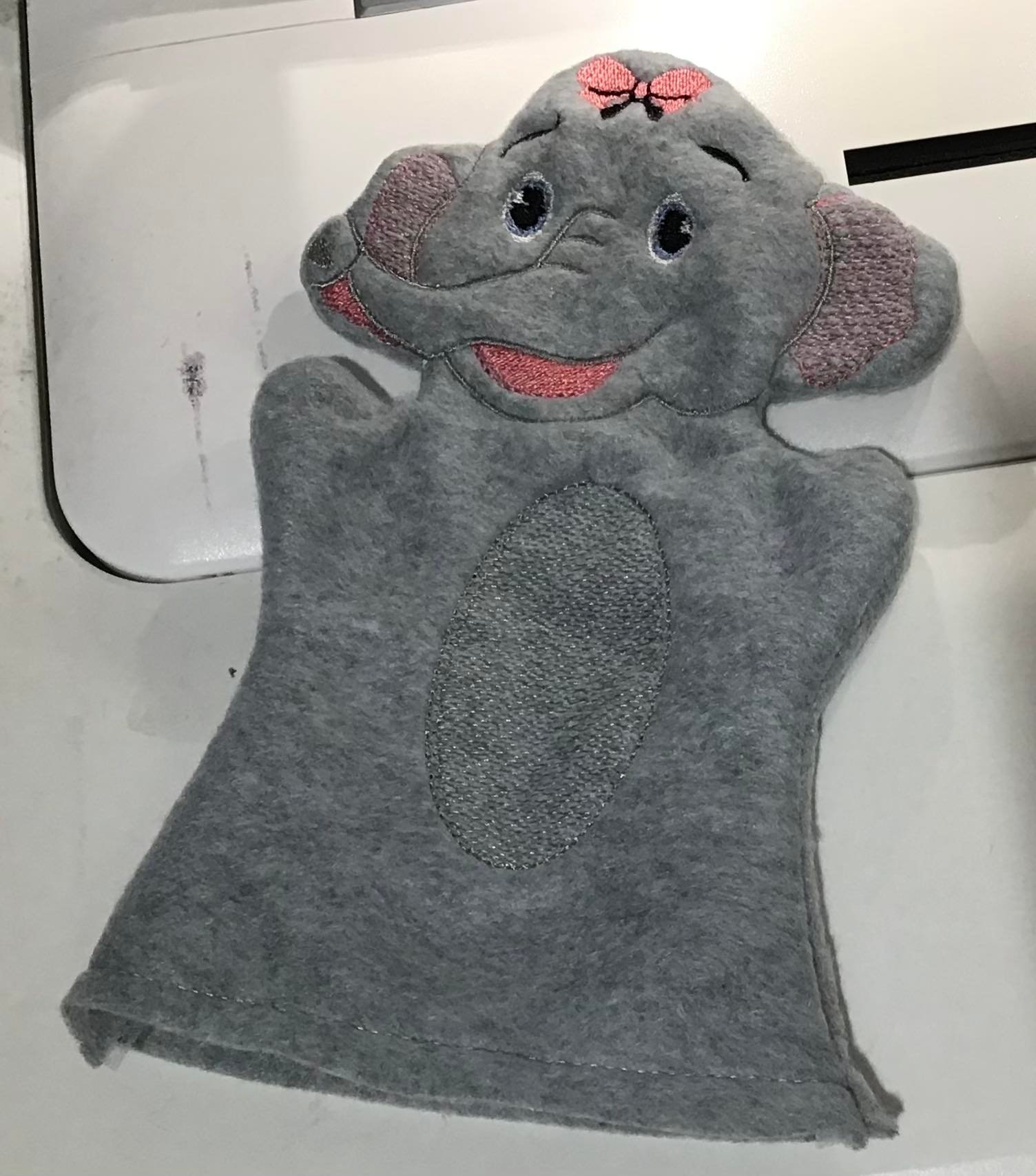 ITH Elephant hand puppet 2 to a hoop 7.5×11, colour sorted for a quick stitchout, suitable for young children