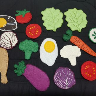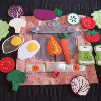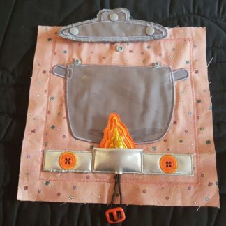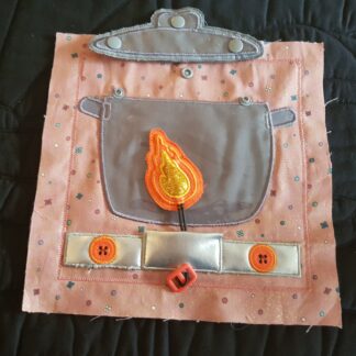 What’s in the pot quiet book page, has an interactive flame under the pot, that has a removable lid and a pile of meat, & veggies, a raw and cooked egg that you can take the lid off and put in the pot and salt & pepper shakers.  The flame turns on and off by pulling the cord.